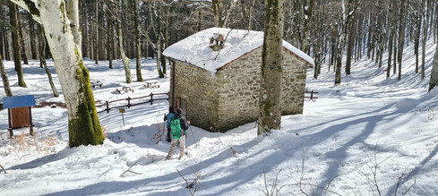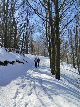 Ci siamo rimessi in cammino stavolta cominciando a scendere di quota per inoltrarci nei boschi di faggio del versante casentinese, che ci hanno regalato scorci unici con una neve ancora più abbondante rispetto al percorso della mattina, ma un po' più ghiacciata.